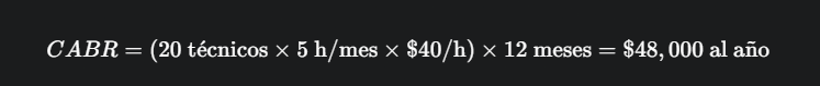 Ejemplo Práctico: Imaginemos una planta con 20 técnicos (Nt=20). Si, de forma conservadora, cada uno pierde solo 5 horas al mes buscando piezas (Hb=5) y el costo por hora es de $40 (Ch=40), el cálculo sería: