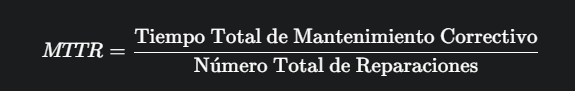 El MTTR (Mean Time to Repair) es uno de los indicadores de rendimiento (KPI) más críticos en mantenimiento. Su fórmula es: