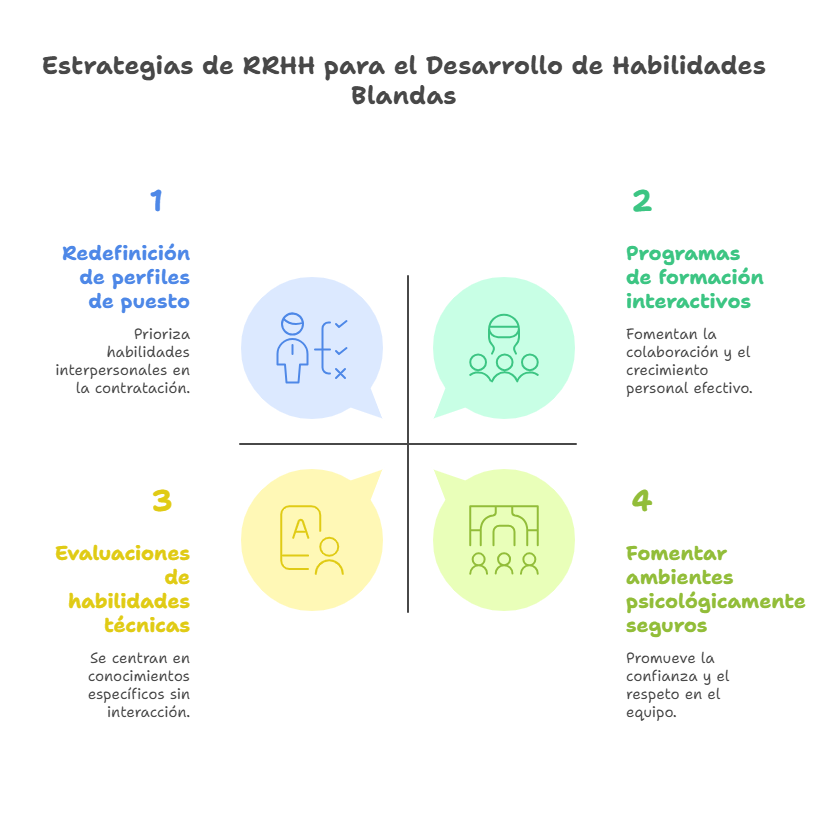 El rol de Recursos Humanos en esta dimensión es doble. Por un lado, ofrece espacios de formación continua, como talleres, cursos o mentorías que desarrollen estas habilidades de manera intencional. Por otro lado, actúa como facilitador cultural, promoviendo ambientes de trabajo psicológicamente seguros donde las personas se sientan valoradas, escuchadas y comprendidas.