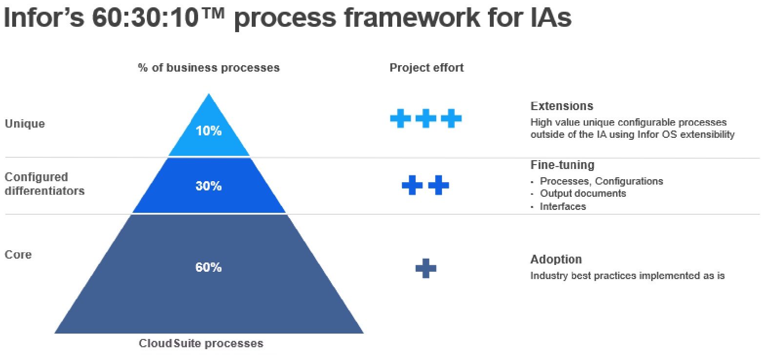 Infor Deployment Accelerators use a 60: 30: 10® approach so that each organization can prioritize which processes need to be differentiated to meet their unique business needs.